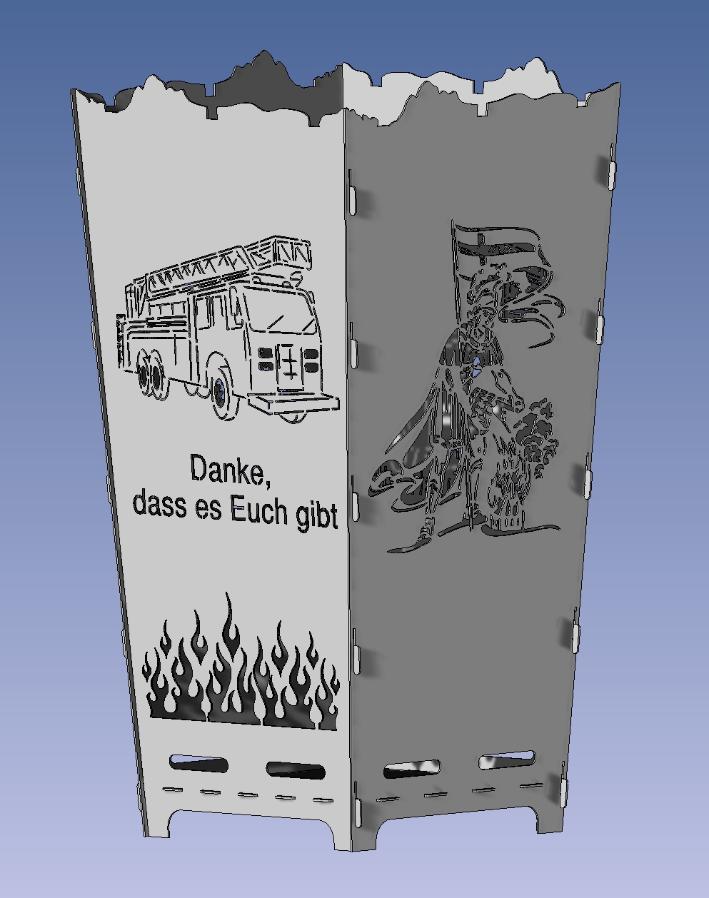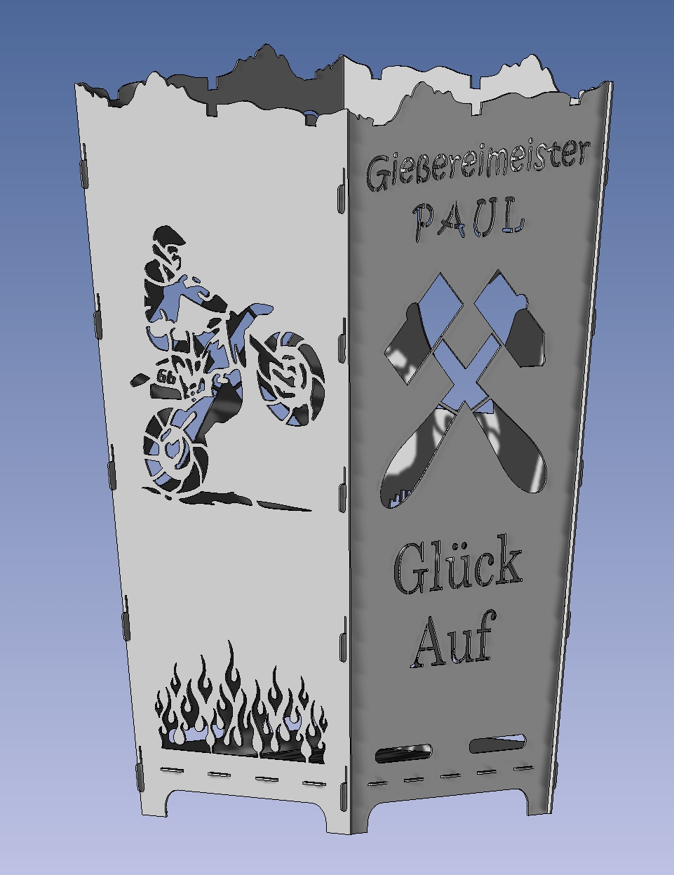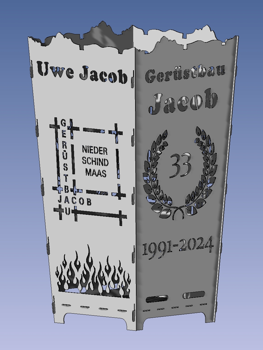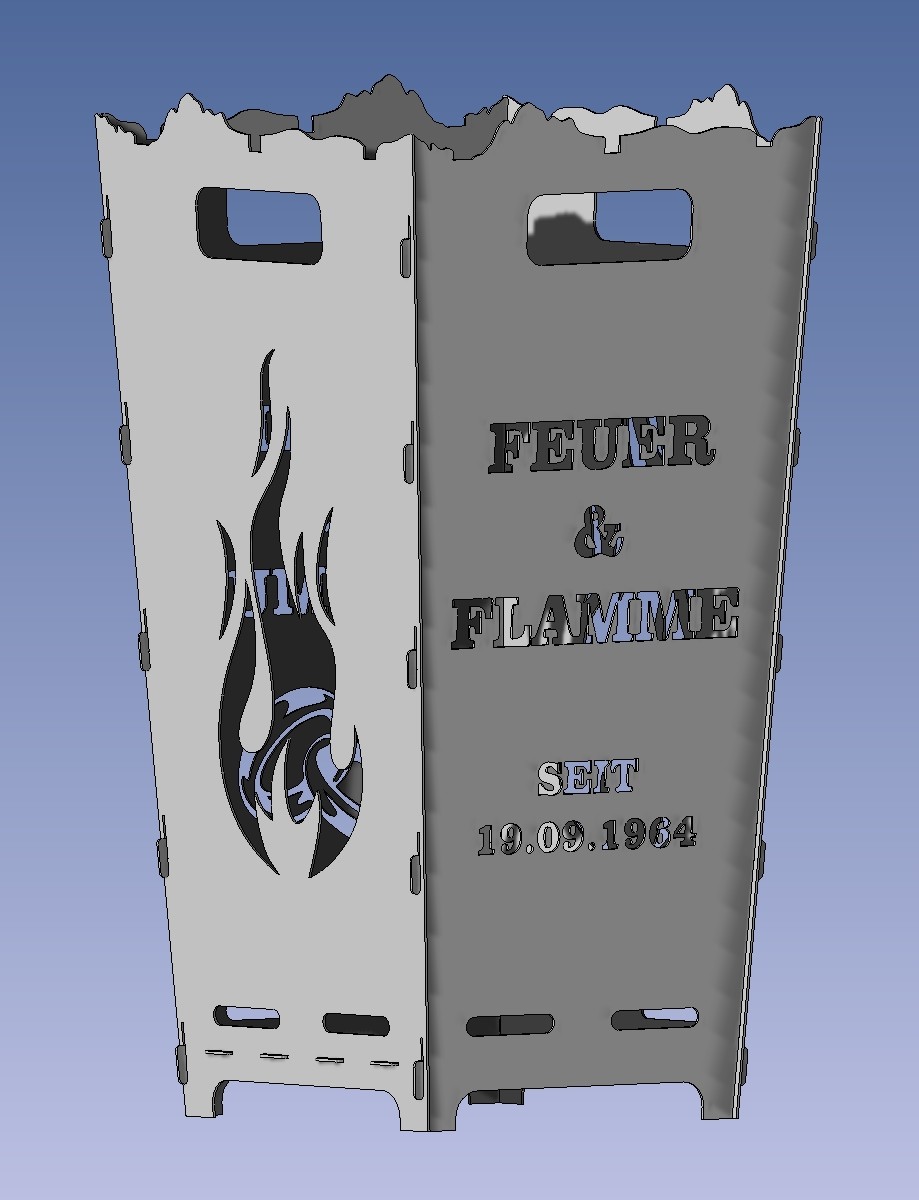 Sie wollen unterschiedliche Motive kombinieren oder haben ein eigenes Motiv, Logo oder Skizze? Auf der Seite Feuerkorb Wunschdesign können Sie uns Ihre persönlichen Wünsche mitteilen und auch Dateien zusenden.
